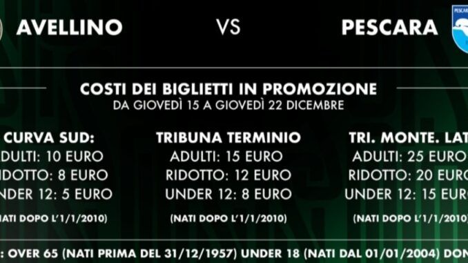 Partirà domani mattina, giovedì 15 dicembre 2022, alle ore 09.30 la prevendita in vista della diciannovesima giornata del campionato di Serie C, Girone C, tra Avellino e Pescara prevista per venerdì 23 dicembre 2022 alle ore 17.30 presso lo stadio Partenio – Lombardi di Avellino.