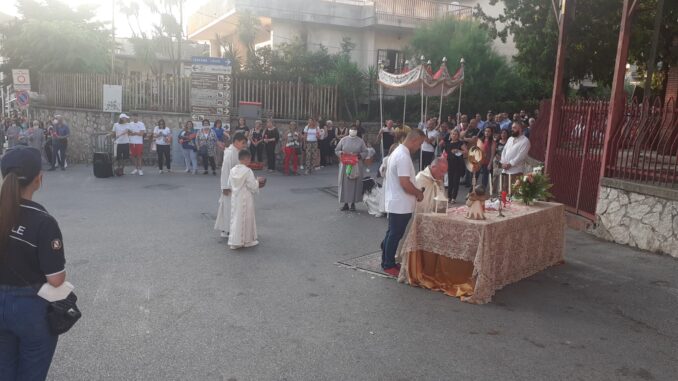 Dopo la sospensione per un biennio dovuto alla pandemia, quest’anno è ripresa la tradizionale processione del Santissimo Sacramento meglio nota come il Corpus Domini con la benedizione degli altari allestiti lungo il tracciato. Rito presieduto dal parroco Padre Domenico La Manna con la partecipazione ufficiale della neo amministrazione Comunale con sindaco in testa Sabatino Tronchese che per l’occasione ha ricevuto gli auguri del parroco e benedizione di buon lavoro. Non è mancata la Protezione Civile ATaAPC coordinata da Gioacchino Iovino per l’assistenza ai presenti con il rispetto delle norme per prevenire i contagi.
