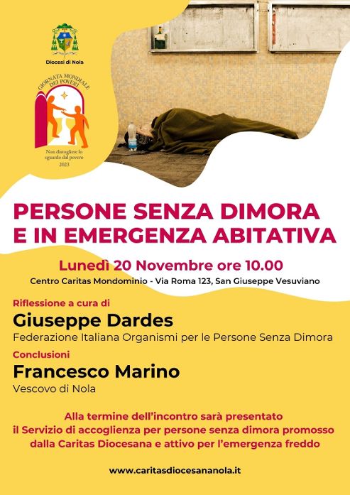 Lunedì 20 novembre 2023, alle ore 10, a San Giuseppe Vesuviano, presso il Centro della Caritas di Nola «Don Tonio Bello-Mondominio», i responsabili della promozione della carità della Chiesa di Nola e gli assessori alle politiche sociali dei 45 comuni del territorio diocesano si ritroveranno per confrontarsi sul tema “Persone senza dimora e in emergenza abitativa” con Giuseppe Dardes, responsabile della formazione presso la Federazione italiana organismi per le Persone senza dimora.