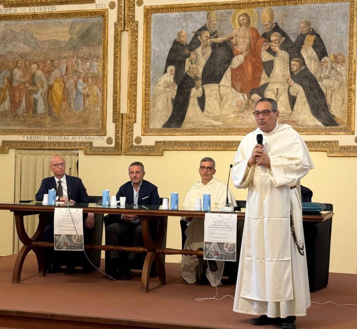 È stato presentato al Santuario di Madonna dell’Arco il volume I miracoli della Madonna dell’Arco. La storia del culto raccontata in un museo scritto da padre Gianpaolo Pagano, rettore del Santuario, e da Mimmo Granata, bibliotecario e archivista, un’opera intensa e ricca di significati che raccoglie secoli di fede popolare attraverso la narrazione degli ex voto conservati nel museo annesso al Santuario, vere e proprie testimonianze materiali dei miracoli attribuiti alla Vergine dell’Arco, segni di devozione profonda che raccontano storie di guarigioni, grazie ricevute, scampati pericoli e che diventano pagina dopo pagina il filo conduttore di una narrazione che unisce spiritualità, cultura e storia sociale del territorio vesuviano con un linguaggio accessibile ma rigoroso, arricchito da immagini e analisi documentarie che restituiscono dignità e valore a oggetti che parlano di fede vissuta, sofferta, gridata e ringraziata come ha sottolineato padre Pagano nel corso della presentazione ricordando che ogni ex voto è una preghiera muta che continua a parlare mentre Granata ha evidenziato come il museo non sia solo un contenitore ma uno spazio vivo dove la memoria diventa racconto collettivo un libro che è anche invito a visitare quei locali silenziosi e pieni di emozione dove ogni oggetto custodisce una storia e ogni storia diventa un frammento dell’anima di un popolo quello dei fujenti e dei devoti che da secoli si rivolge alla Madonna dell’Arco con fiducia e amore.
