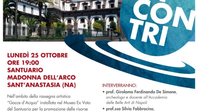 Ancora una volta, “Gocce d’Acqua”, l’installazione artistica ideata da Giuseppe Ottaiano, creativo e titolare della storica Agenzia di Comunicazione “SEMA”, passando per la sensibilizzazione, si intreccia con la Fede. La mostra, installata nei locali del Museo degli Ex Voto e nella “Sala Capitolare” del Santuario della Madonna dell’Arco, e finalizzata alla promozione delle risorse turistico-ambientali della Regione Campania, va oltre l’estetica diventando spunto di riflessione alla tutela e alla custodia dell’acqua, elemento indispensabile alla vita di ogni essere vivente. In quest’ottica, lunedì la ottobre, alle ore 19,00, nella “Sala Capitolare” del Santuario della Madonna dell’Arco si terrà una tavola rotonda sul tema “Il problema dell’acqua: «una questione educativa e culturale»”, sollevato da Papa Francesco nell’Enciclica Laudato sì n.30. L’incontro è organizzato dal Promotorato per la Custodia e Salvaguardia del Creato della Provincia San Tommaso dei frati domenicani del sud Italia, rappresentati dal dott. Biagio Scognamiglio, presidente dei Periti Agrari di Napoli. Per l’occasione interverranno: