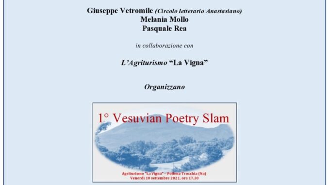 L’incontro a Pollena, che si intitola “1° Vesuvian Poetry Slam”, si svolgerà dunque presso l’Agriturismo “La Vigna” venerdì 10 settembre alle ore 17.30. L’organizzazione e la conduzione sono affidate agli operatori culturali Melania Mollo, Pasquale Rea e Giuseppe Vetromile (Circolo Letterario Anastasiano), con la collaborazione dell’Agriturismo “La Vigna”, del “Club Napoli Pollena Trocchia”, del “Club House Artisti” e della Pro Loco di Pollena Trocchia.