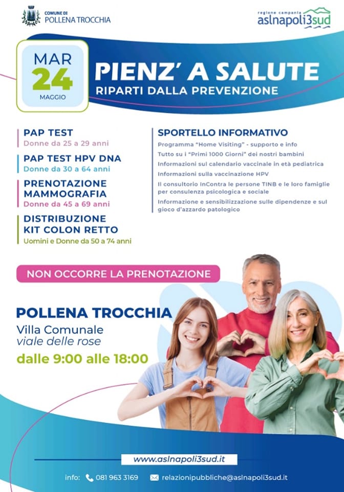 È fissato per martedì 24 maggio il nuovo appuntamento sul territorio con “Pienz’ a salute”, l’iniziativa promossa dall’Asl Napoli 3 Sud dedicata alla prevenzione. Nel corso dell’evento, in programma dalle ore 9:00 alle ore 18:00 presso l’area ludico-ricreativa di viale delle Rose, al Parco Europa, saranno eseguiti da personale esperto Pap test per donne da 25 a 29 anni, Pap Test HPV dna per donne da 30 a 64 anni, sarà possibile la prenotazione delle mammografie per le donne dai 45 ai 69 anni, sarà distribuito il kit colon retto per uomini e donne da 50 a 74 anni. Infine, sarà anche attivo uno sportello informativo nell’ambito del programma “Home Visiting”, che fornirà supporto, informazioni e consulenza per le neomamme, informazioni sul calendario vaccinale in età pediatrica, informazioni sulla vaccinazione HPV. «La pandemia da Covid-19 e le limitazioni introdotte per il suo contrasto hanno inevitabilmente ostacolato le campagne di prevenzione e di screening della popolazione condotte dalle Asl, ma finalmente si sta riprendendo questa attività fondamentale per la salute pubblica, necessaria per fornire alla popolazione rassicurazioni sul proprio stato di salute o, in caso contrario, il vantaggio di una diagnosi precoce. Per questo motivo ospitiamo ancora una volta e con la stessa convinzione di sempre questa iniziativa dell’Asl Napoli 3 Sud invitando i nostri concittadini a partecipare» ha detto il sindaco di Pollena Trocchia Carlo Esposito. Nel corso della manifestazione prevista anche informazione e sensibilizzazione sulle dipendenze e sul gioco d’azzardo patologico. Il consultorio, infine, incontra le persone TINB (Transgender e con identità non binaria) e le loro famiglie per consulenza psicologica e sociale.