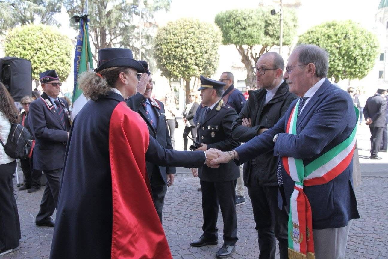 A seguire, il corteo istituzionale si è diretto verso Piazza Bartolo Longo, al Monumento ai Caduti, dove è stata deposta una corona d’alloro in onore di chi ha sacrificato la propria vita per la libertà. Un momento solenne, accompagnato da un silenzio carico di rispetto e partecipazione da parte della cittadinanza presente.