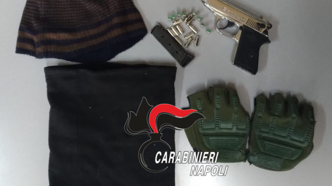 Era appostato a pochi metri dall’ingresso di una farmacia di Via Sotto il Monte a Pozzuoli. Calzava uno scaldacollo che gli copriva parte del volto e un cappellino marrone di lana. Impugnava con la mano destra una pistola argentata, con la sinistra un caricatore. Quando una pattuglia dei carabinieri della stazione di Pozzuoli è transitata davanti alla farmacia, l’uomo ha nascosto arma e serbatoio in una falda del giubbino. Il movimento non è sfuggito ai militari che hanno immediatamente interrotto la marcia e raggiunto il malvivente.