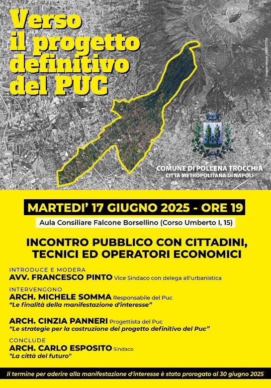 Verso il progetto definitivo del PUC. È questo il titolo scelto per l’appuntamento di informazione e partecipazione messo in calendario dall’Amministrazione comunale di Pollena Trocchia per il prossimo 17 giugno quando, a partire dalle ore 19, l’aula consiliare “Falcone-Borsellino” ospiterà un incontro pubblico con cittadini, tecnici ed operatori economici. Sotto la luce dei riflettori, il Piano Urbanistico Comunale, che sarà al centro degli interventi dell’architetto Michele Somma, responsabile comunale del Puc, che illustrerà le finalità della manifestazione di interesse per il potenziamento e/o nuovo insediamento di attività volta alla definizione del dimensionamento delle attività non residenziali del Piano,  il cui termine di adesione è stato prorogato al 30 giugno, e l’architetto Cinzia Panneri, progettista dello strumento di pianificazione urbanistica, che metterà in evidenza le strategie per la costruzione del progetto definitivo del PUC. «Il Piano Urbanistico comunale è sempre più vicino a divenire realtà, per questo motivo abbiamo ritenuto opportuno programmare un nuovo incontro pubblico che possa spiegare le ragioni che hanno animato le nostre scelte per il futuro del nostro territorio, ma anche modi e tempi per il coinvolgimento attivo di cittadinanza e stakeholder» ha detto Francesco Pinto, vicesindaco delegato all’urbanistica, che martedì introdurrà e modererà l’incontro. «Questa Amministrazione comunale da tempo lavora per lo sviluppo organico e coerente del nostro territorio, ma anche partecipato e condiviso. Martedì sarà la giusta occasione per un confronto costruttivo con la cittadinanza e i professionisti, che avvicinerà il nostro comune di un ulteriore passo al raggiungimento di un obiettivo fondamentale per l’intero territorio» ha spiegato Carlo Esposito, a cui saranno affidate le conclusioni dell’incontro di martedì.