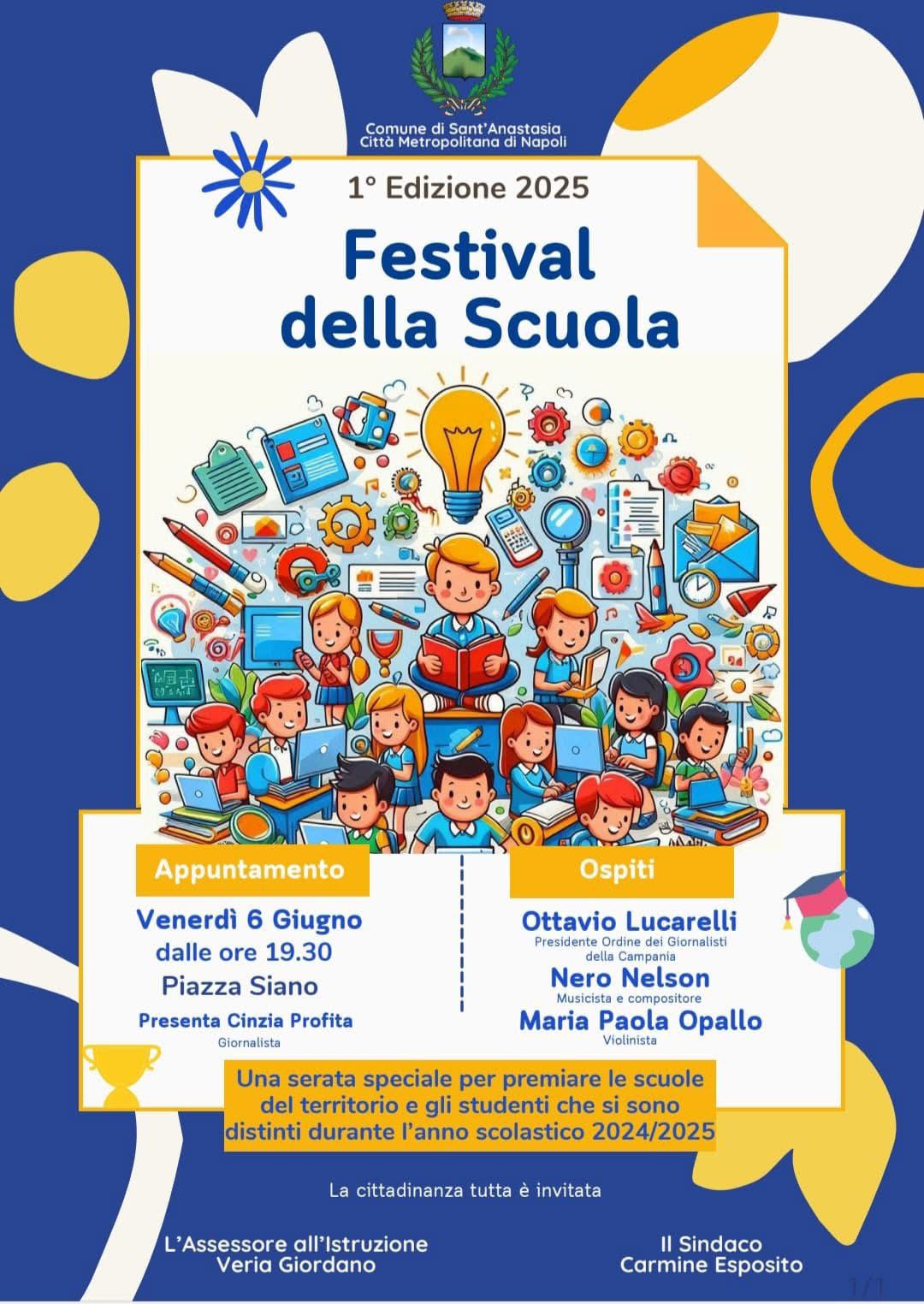 Al termine dell’incontro, la manifestazione si sposterà in piazza Siano con il Festival della Scuola, momento conclusivo di un percorso di programmazione integrata portato avanti negli ultimi anni. Sul palco, il riconoscimento a tutte le scuole del territorio e agli studenti che si sono distinti durante l’anno scolastico, in un clima di festa e gratitudine.
