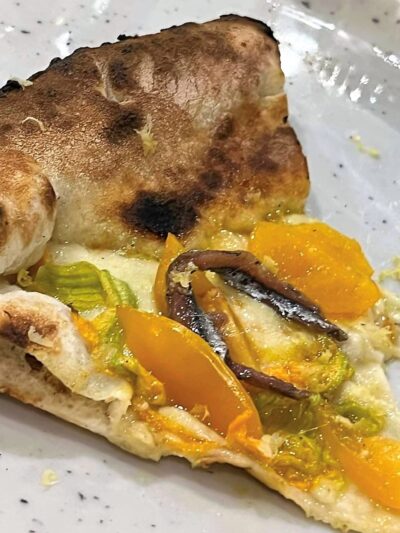 Sempre intramontabile ed irresistibile la tradizionale Marinara, ancora più gustosa nella versione originale “Fiori & alici” che, all’impasto tradizionale con provola e alici di Cetara, coniuga anche i leggiadri e squisiti fiori di zucca, la dolcezza dei datterini gialli e la pungenza agrumata delle zeste di limone. Anche qui, in pairing Caprettone Olivella mentre, per le birre, la English Ale dei Monaci Vesuviani.