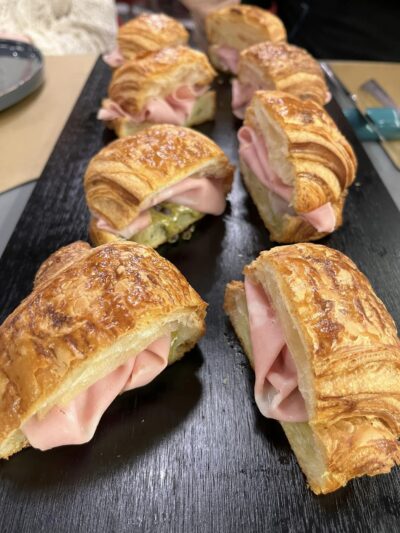 A seguire, la pasta sfoglia croissant con gocce di cioccolato, ispirata al francese “pain au chocolat”, farcita di mortadella, crema di pistacchio e lime.